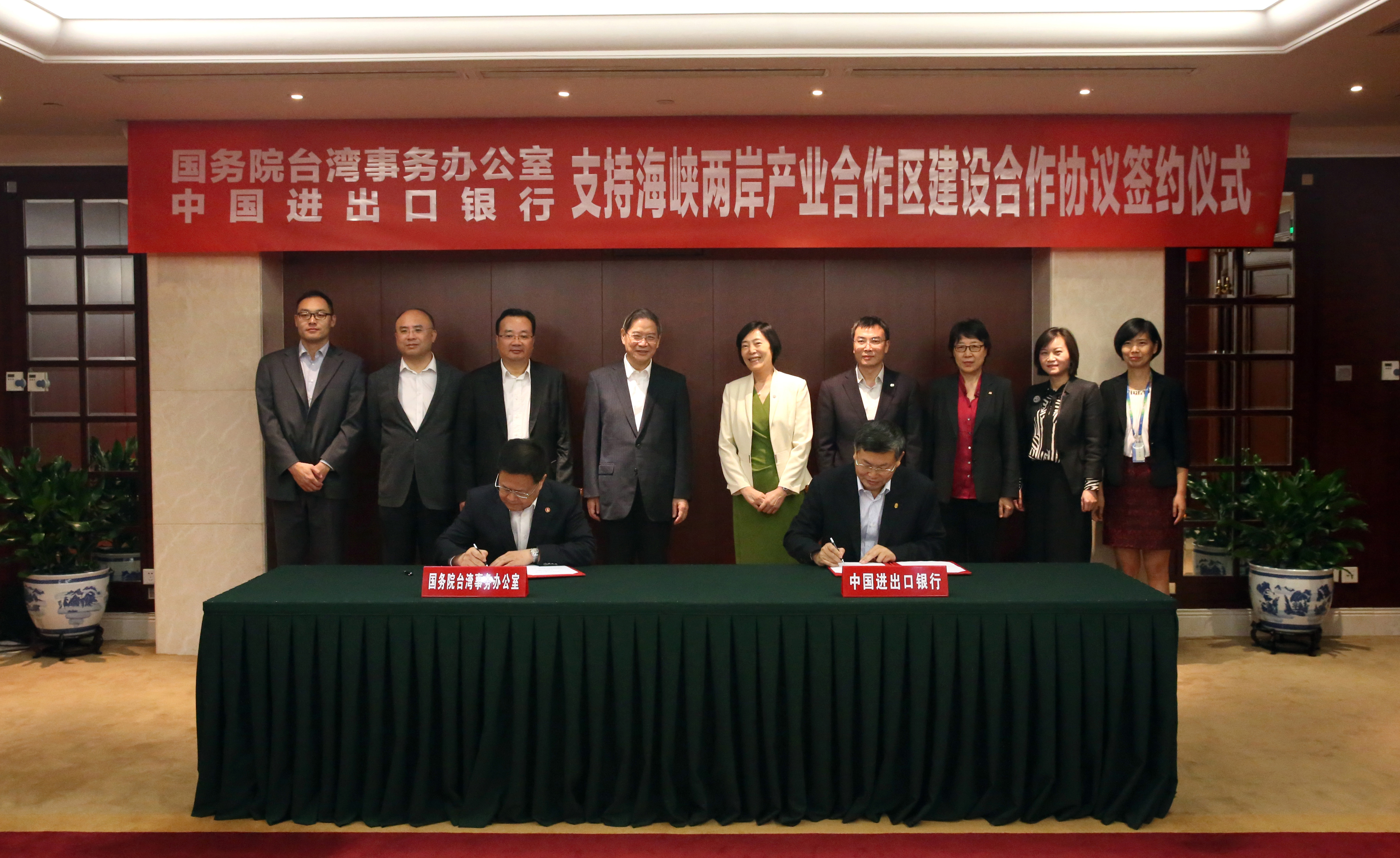 9月29日,进出口银行与国务院台湾事务办公室(以下简称“国台办”)签署支持海峡两岸产业合作区建设合作协议。进出口银行董事长胡晓炼、副行长孙平,国台办主任张志军、副主任郑栅洁等出席签约仪式。孙平副行长和郑栅洁副主任分别代表双方签署协议。